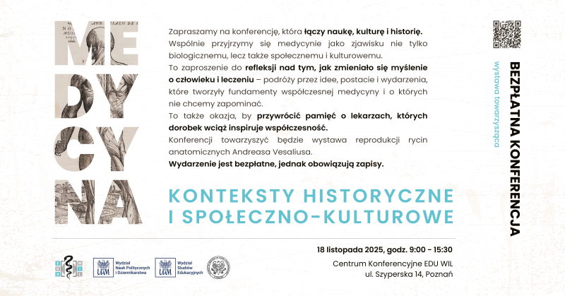 18 listopada 2025 roku w godzinach 9:00–15:30 w Centrum Konferencyjnym EDU WIL przy ul. Szyperskiej 14 w Poznaniu odbędzie się bezpłatna konferencja „Medycyna – konteksty 2025”. Wydarzenie poświęcone będzie refleksji nad medycyną jako zjawiskiem nie tylko biologicznym, lecz także społecznym i kulturowym.