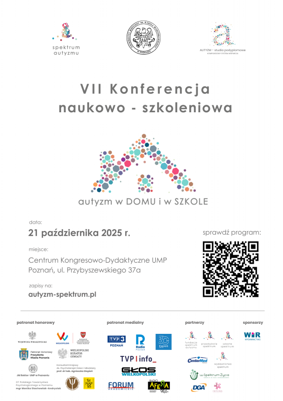 Konferencja odbędzie się pod patronatem honorowym: Wojewody Wielkopolskiej, Marszałka Województwa Wielkopolskiego, JM Rektora Uniwersytetu Medycznego w Poznaniu, a także czołowych instytucji zajmujących się zdrowiem psychicznym i wsparciem osób w spektrum: Konsultanta Krajowego ds. Psychoterapii Dzieci i Młodzieży, Polskiego Towarzystwa Psychologicznego, Oddziału Terenowego PTP w Poznaniu oraz Fundacji SYNAPSIS.